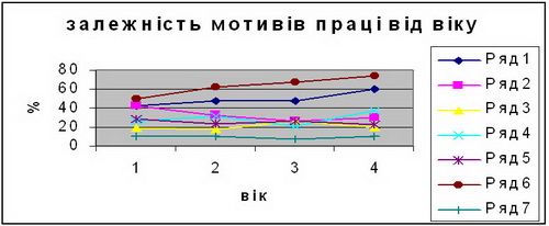 За результатами опитування встановлено, що мотив: "бажання принести користь суспільству і людям" найбільш важливий для службовців віком 50-59 років (73.9%) і менш важливий для 19-29 (50.5%) років.