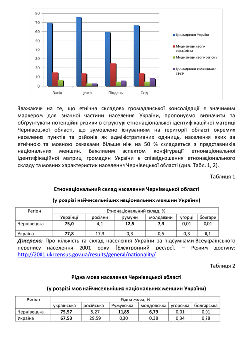 Джерело: Перепис населення. Національний склад населення, мовні ознаки, громадянство. Національність та мовні ознаки. 19A050501_02_073. Розподіл населення за рідною мовою, Чернівецька область (1, 2, 3, 4) [Електронний ресурс]. – Режим доступу: http://database.ukrcensus.gov.ua/MULT/Database/Census/databasetree_uk.asp Дані, наведені в Таблицях 1 та 2, дозволяють зробити такі висновки. По-перше, за результатами Всеукраїнського перепису населення України 2001 р. у Чернівецькій області зафіксована кількісна перевага українців над представниками інших національностей. По-друге, в області найбільш чисельними меншинами є румунська (12,5 %) та молдовська (7,3 %), які в інших регіонах України чисельно не перевищують 0,2 % [4]. По-третє, порівнюючи мовну та етнічну самоідентифікації, офіційно задекларовані під час Всеукраїнського перепису населення України, встановлюємо, що серед представників румунської та молдовської етнічних меншин кількість тих, що визнають мову меншини як рідну, є меншою. Для вироблення ефективних механізмів консолідації української нації не менш важливим аспектом конфігурації етнонаціональної ідентифікаційної матриці є визначення місця етнічних меншин в структурі адміністративного поділу Чернівецької області. Характеризуючи румунську етнічну меншину в структурі адміністративного поділу області, зауважимо, що, частка румунів як найбільшої етнічної меншини в області, в м. Чернівці є мінімальною та становить 3,26 % від загальної кількості обласного центру [5]. Румунська меншина сконцентрована у чотирьох районах області. По-перше, у Герцаївському районі частка румунів та тих, що визнають румунську мову рідною, становить 92,22 %, причому в адміністративному центрі району – м. Герца чисельно румун менше, ніж в цілому по району – 68,98 % [5]. Принагідно зауважимо, що Герцаївський район був утворений в складі Чернівецької області 1 жовтня 1940 р., у 1962 р. – ліквідований, а його територія увійшла до складу Глибоцького району [6]. У грудні 1991 р. Герцаївський район було відновлено в складі Чернівецької області відповідною постановою Верховною Радою України [7]. Специфікою району є те, що він єдиний на території Чернівецької області, який не межує з сільськими адміністративними одиницями, що мають інший етнічний склад (на заході район межує з Глибоцьким районом; на півночі і північному сході вздовж р. Прут з Новоселицьким районом та м. Чернівці; на півдні – з Румунією) [6]. По-друге, у Глибоцькому районі частка румунів становить 40,10 %, однак у шести сільських радах етнічні румуни становлять понад 90 % населення (Багринівська, Волоківська, Йорданештська, Карапчівська, Купська, Синьовецька) [5]. Специфікою позначений етнічний склад у межах Опришенської сільради, в якій проживає 8,63 % румунів, проте в с. Опришени – 94,93 %, а в с. Слобідка – 6,26 %. По-третє, у Новоселицькому районі проживає 9,3 % румунів, переважно в Боянівській (60,97 %) та Магальській (40,57 %) сільрадах; 54,70 % мешканців Новоселицького району позиціонують себе як молдавани [5]. Зауважимо, що специфікою Новоселицького району є поєднання моноетнічних українських та моноетнічних молдовських сіл. По-четверте, у Сторожинецькому районі проживає 35,40 % румун, які сконцентровані у смт Красноїльськ та 6 сільрадах (Верхньопетрівецька, Їжівська, Чудейська, Нижньопетрівецька, Ропчанська, Черешська), в яких кількісно румунська етнічна група становить від 71,25 % до 