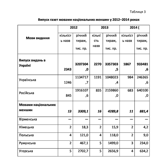 Джерело: Випуск періодичних та продовжуваних видань мовами національних меншин у 2009 – 2014 роках / Державний комітет телебачення і радіомовлення України [Електронний ресурс]. – Режим доступу: http://comin.kmu.gov.ua/control/uk/archive/docview?typeId=58944&docId=119327&search_param=%ED%E0%F6%B3%EE%ED%E0%EB%FC%ED%E8%F5+%EC%E5%ED%F8%E8%ED&searchDocarch=1&searchPublishing=1 Дані Таблиці 3 засвідчують, по-перше, що російська мова видання не позиціонується як мова національної меншини, по-друге, у 2014 р, порівняно з 2013 р., кількість газет, що видавалися в Україні російською мовою, зменшилася на 18,2 % (ця цифра зіставна зі зменшенням кількості газет українською мовою – 17,38 %), польською – на 50 %, румунською – на 40 %, угорською на 20 %. Попри те, що кількість видань німецькою мовою у 2014 р. не зменшилася, кількість річного тиражу знизилася на 73,5 % (тираж газет польською мовою знизився на 92 %, румунською – 84 %, угорською – 76 %). Однак скорочення кількості тиражів та газет мовами національних меншин, що видаються за фінансової допомоги Української держави, суттєво не вплинула на інформаційну насиченість регіональних інформаційних просторів національних меншин. Так, за інформацією Чернівецької ОДА у Чернівецькій області видається 67 газет та інших періодичних видань мовами національних меншин, а “за сприяння обласної державної адміністрації для представників нацменшин створено веб-сайт “Буковина толерантна” [17]. Хоча, на нашу думку, за умови більш динамічного оновлення, саме цей інформаційний ресурс зміг би стати тим простором, у якому могла відбуватися ефективна міжкультурна комунікація з контекстом громадянської ідентичності. Скорочення обсягу інформації мовою національних меншин, поширення якої фінансується державою, вказує на те, що за умови збереження орієнтації національних меншин на отримання інформації рідною мовою знижується можливість поширення маркерів громадянської ідентифікації в комунікативному просторі національних меншин, й отже, використання дискурсивних механізмів політики громадянської консолідації української нації. Отже, концентрація національних меншин в окремих населених пунктах чи територіально-адміністративних одиницях, в контексті необхідності громадянської консолідації української нації та функціонального використання її маркерів, потребує застосування проектного підходу як основи вироблення механізмів громадянської консолідації. У нашому випадку, державні проекти з формування громадянської ідентичності в поліетнічних регіонах України з чисельним домінуванням етнонаціональних меншин розумітимемо як один зі способів конструювання об’єкта (громад) з бажаними функціями та характеристиками. Зауважимо, що не йдеться про зміну етнонаціонального складу громад. На тлі відсутності стратегічної концепції громадянської консолідації в Україні переваги використання проектного підходу дозволять Українській державі раціонально концентрувати зусилля, що генеруватимуть бажані та необхідні зміни в системі суспільно-політичних відносин та ефективно розподіляти ресурси. Найбільш бажаним для України є одночасне використання стратегічного планування, яке поширюватиметься на територію всієї країни, та проектного підходу, сконцентрованого навколо визначених цільових аудиторій – етнічних меншин. Ідеологією проектного підходу, на нашу думку, мають стати принципи політики громадянс