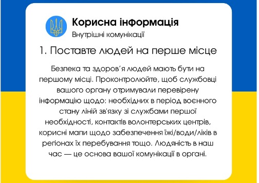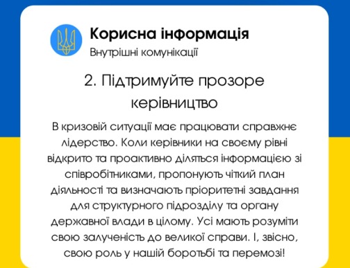 Наразі ж така допомога потрібна і на інформаційному полі. Відтак потрібно подбати про внутрішню комунікацію в органі, її якість, достовірність та змістовність. Для початку переконайтеся, що існуючі внутрішні канали комунікації доступні для усіх службовців вашого органу. А далі вам допоможуть декілька важливих моментів.