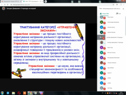 16 та 18 червня 2020 року Чернівецьким регіональним центром перепідготовки та підвищення кваліфікації працівників органів державної влади, органів місцевого самоврядування, державних підприємств, установ та організацій був проведений короткостроковий семінар за дистанційною формою навчання в режимі онлайн, за допомогою платформи Google Meet, на тему «Впровадження змін як механізм управління» для державних службовців категорії «Б» Головного управління Пенсійного фонду України в Чернівецькій області. Семінар провів Богдан Дмитрович Сторощук – кандидат економічних наук, доцент кафедри економічної теорії, менеджменту та адміністрування Чернівецького національного університету імені Юрія Федьковича. Метою семінару було надання систематизованих знань про принципи, моделі та методи реалізації опору змінам, оволодіння практичними знаннями та одержання практичних навичок із організації процесу управління змінами, а також визначення необхідності впровадження змін за сучасних умов в процесі управління в органах публічної влади. Протягом навчання слухачі опрацювали такі теми, як природа, джерела та необхідність проведення змін, класифікація організаційних змін, лідерство та керівництво в управлінні змінами, моделі управління змінами, підготовка до змін та їх планування, механізм реалізації змін. Достатня увага на семінарі була приділена традиційним та сучасним методам управління змінами, організаційному розвитку та змінам у стратегії організації. Семінар пройшов у невимушеній обстановці, з використанням презентацій. У кожного з учасників була можливість поділитися своїм поглядом з того чи іншого питання, що стосується тематики даного заходу. По завершенні карантину слухачі отримають сертифікат про підвищення кваліфікації встановленого зразка. |