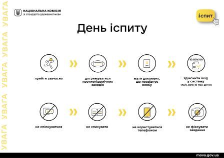 • загальна інформація щодо змісту іспиту («Тестування», «Говоріння»), як технічно виконувати кожен блок;