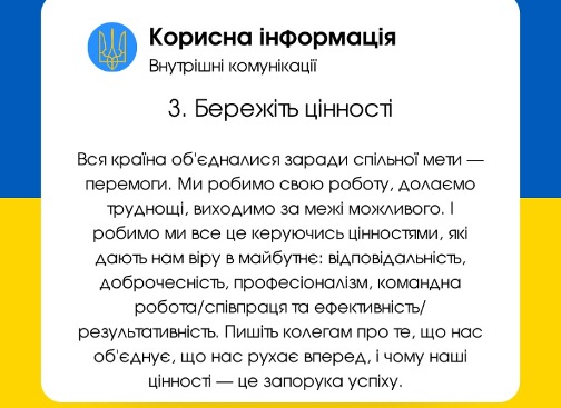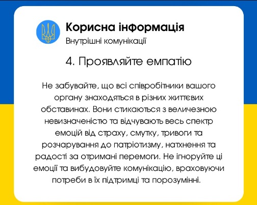 Наразі ж така допомога потрібна і на інформаційному полі. Відтак потрібно подбати про внутрішню комунікацію в органі, її якість, достовірність та змістовність. Для початку переконайтеся, що існуючі внутрішні канали комунікації доступні для усіх службовців вашого органу. А далі вам допоможуть декілька важливих моментів.