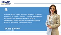 «В умовах війни Україні важливо зберегти кадровий потенціал, а також – дієвість і стійкість державного управління. Наразі країні критично бракує бюджетного фінансування. В умовах скорочення видатків залучаємо міжнародні кошти», - підкреслила Наталія Алюшина.