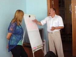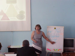 Програма тренінгу складалась з низки лекцій, які почергово змінювалисяпрактичними завданнями, що сприяло закріпленню викладеного матеріалу. Тренінгпроводили Гакман Сергій Михайлович – заступник директора - начальникнауково-дослідного відділу Центру, кандидат історичних наук; Малько Неля Борисівна – директоробласної громадської організації «Асоціація виробників Буковини»; Татарчук Тетяна Михайлівна – начальник відділу регіональногорозвитку та фінансового моніторингу виконавчого апарату Чернівецької обласноїради. Вони надавали вичерпнуінформацію, коментарі та рекомендації, завдяки яким учасники тренінгу отримализнання та навички з управління проектним циклом.